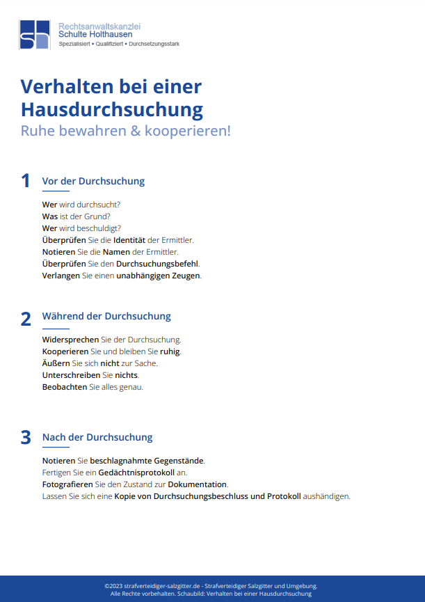 Wenn Strafverfolgungsbehörden eine Hausdurchsuchung durchführen, ist es wichtig, ruhig und besonnen zu bleiben und kooperativ mit den Ermittlern umzugehen. Hier sind einige allgemeine Verhaltensweisen, die während einer Hausdurchsuchung hilfreich sein können:
